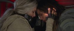 Nonetheless, upon re-entry, van Dyne began to fade out due to Ghost extracting Breakthrough energy, killing van Dyne in the process. Fortunately, Emmet-Man and the Wasp were able to stop Ghost, keeping van Dyne alive. They and so returned from the Breakthrough Realm, but came in too fast and crashed. Van Dyne then exited the vehicle, and saw her girl in front of her. They then hugged each other and became very emotional in their reunion. Pym then followed, reminding them of his being in the crash, while van Dyne talked with Ant-Man, as they addressed how they have already met.